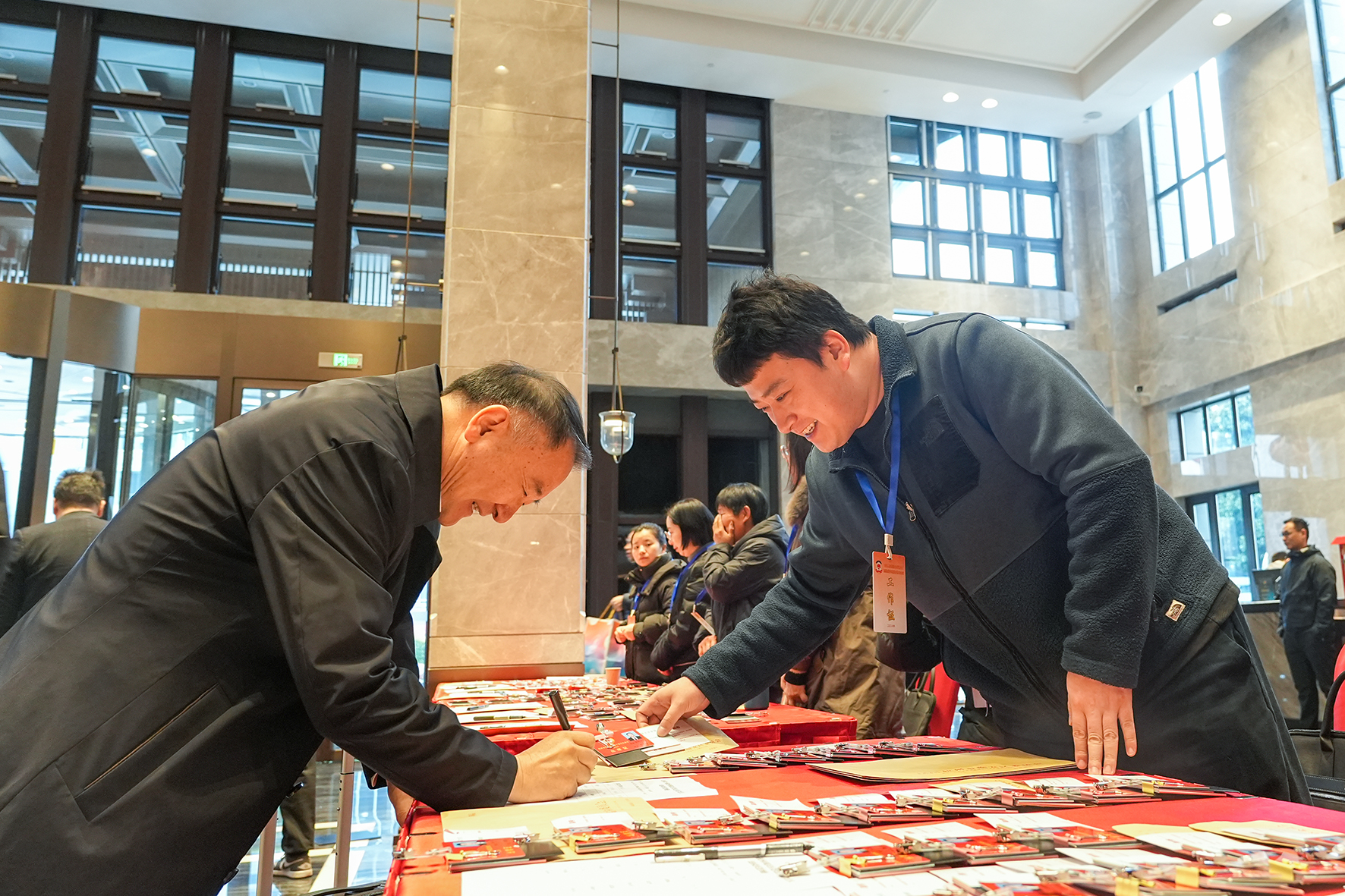 报到现场简洁有序,气氛庄重热烈。上午8时许,委员们步履从容、信心满怀步入驻地,在工作人员引导下,有序签到登记、领取证件。完成报到手续后,不少委员佩戴起鲜红的出席证,在报到背景板前合影留念,记录下这庄严的时刻。